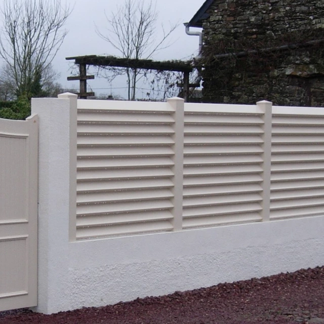 La clôture PVC est principalement composée de barreaudage, avec des sections de profil allant de 60 mm à 120 mm. Cette gamme propose différents types de lisses à positionner aussi bien à la verticale qu’à l’horizontal, pouvant aller jusqu’à un effet brise-vue, ou une section pleine.